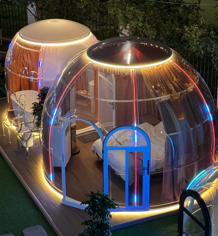 Vraag 3: Is het windbestendig?Met de basis vast en deuren en ramen gesloten, is de koepel van de Star Room ontworpen met een bolvormige vorm, die een lage windweerstand heeft en wind tot niveau 12 kan weerstaan.
